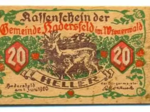 Konon pasca perang dunia I, perekonomian jerman jatuh dalam depresi ekonomi yang cukup memprihatinkan. Pada saat tersebut kemudian orang-orang menggunakan apa yang dapat mereka gunakan sebagai alat pembayaran. Salah satunya adalah potongan kayu yang digambar menjadi uang. Lengkap dengan nominal dan warna-warna, mata uang kayu ini kemudian digunakan sebagai pembayaran yang sah dengan sebutan Notgeld.